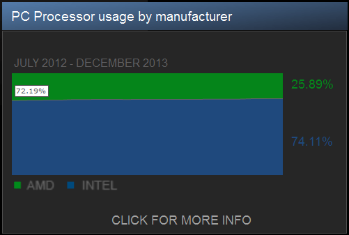 Процессоры Intel предпочитают порядка 74% пользователей Steam, тогда как чипы AMD установлены примерно у четверти любителей поиграть (25,9%). Судя по графику, за последние полтора года доля чипов AMD снизилась примерно на 2%, а Intel, соответственно, возросла на ту же величину. Для систем, используемых для игр, полученное соотношение выглядит не так плохо для AMD, если учесть, что на глобальном рынке CPU x86, компания контролирует около 20% процессоров.